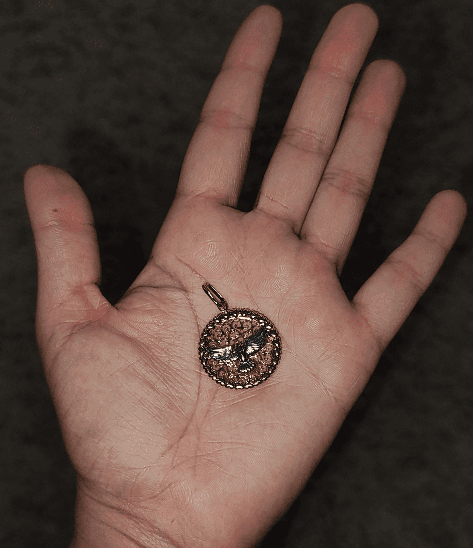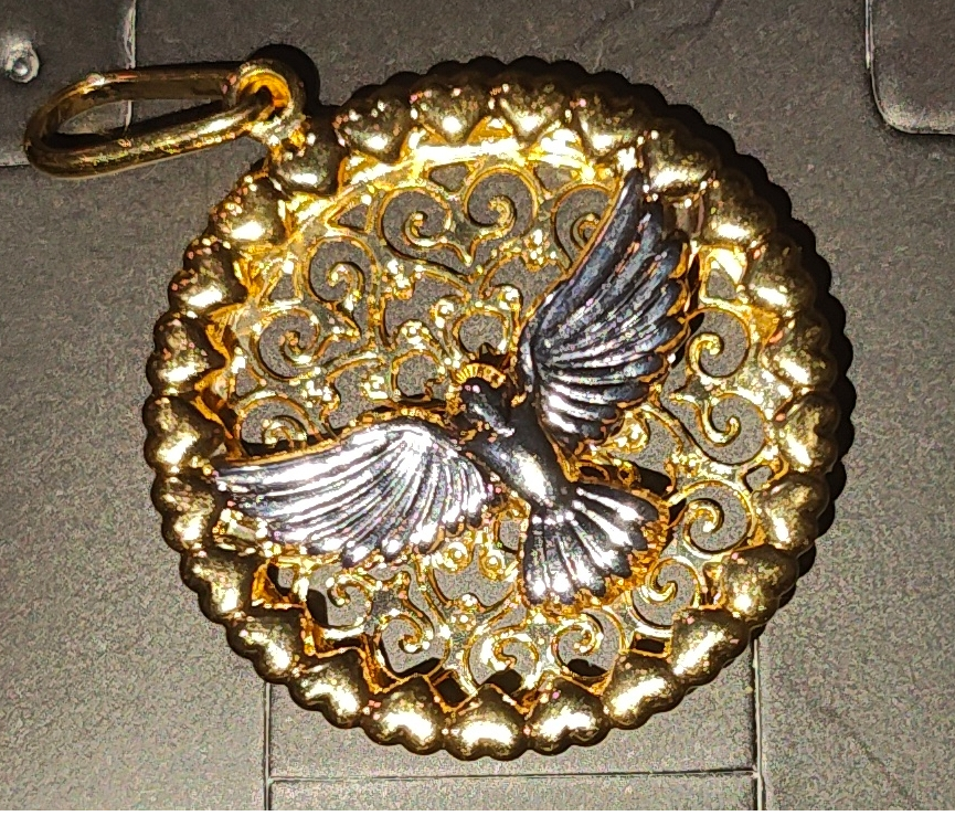 Para contar com a proteção do Espírito Santo em todos os momentos do seu dia, adquira o Pingente Redondo Foto Espírito Santo, folheado a ouro com ródio e corrosão, feito na cor dourada, que vem com contra-argola e mede 2,5x3,6 cm.